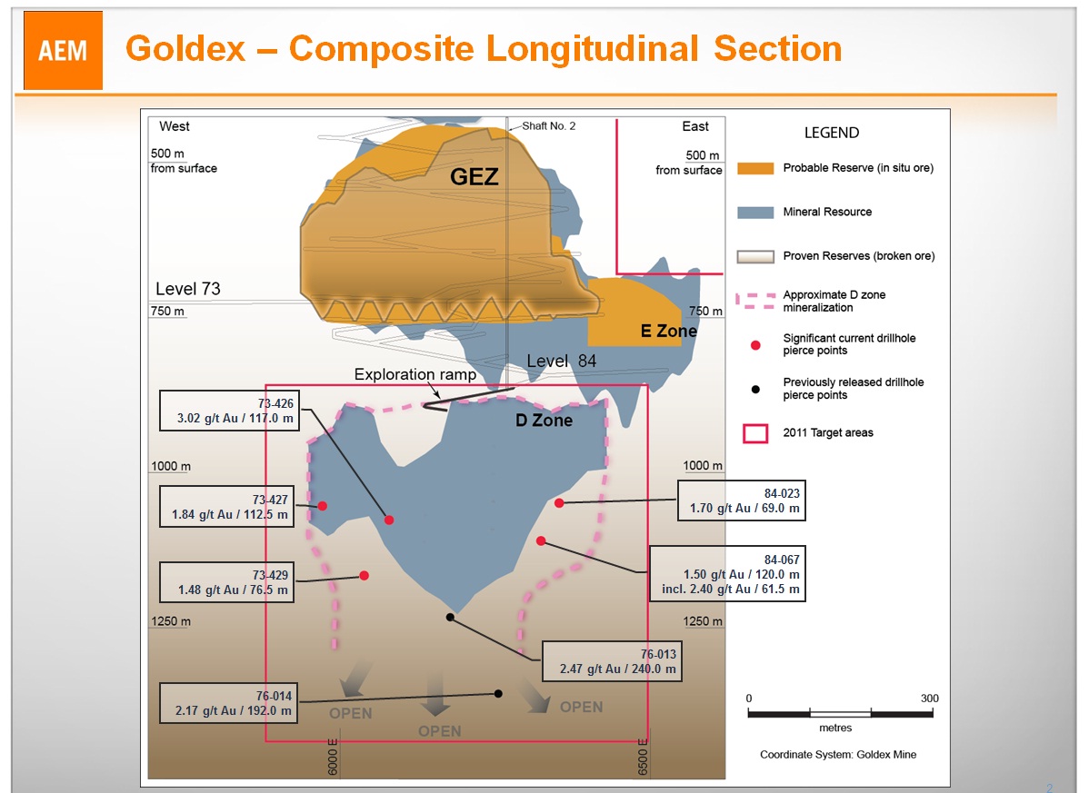 Drilling in 2011 has located mineralization outside of the resource envelope and the deposit remains open at depth. Twenty-one holes (11,272 metres) were drilled in the D Zone during the second quarter. Selected results are shown in the table below, with the pierce points of these drill holes shown on the longitudinal section for the Goldex Mine.
